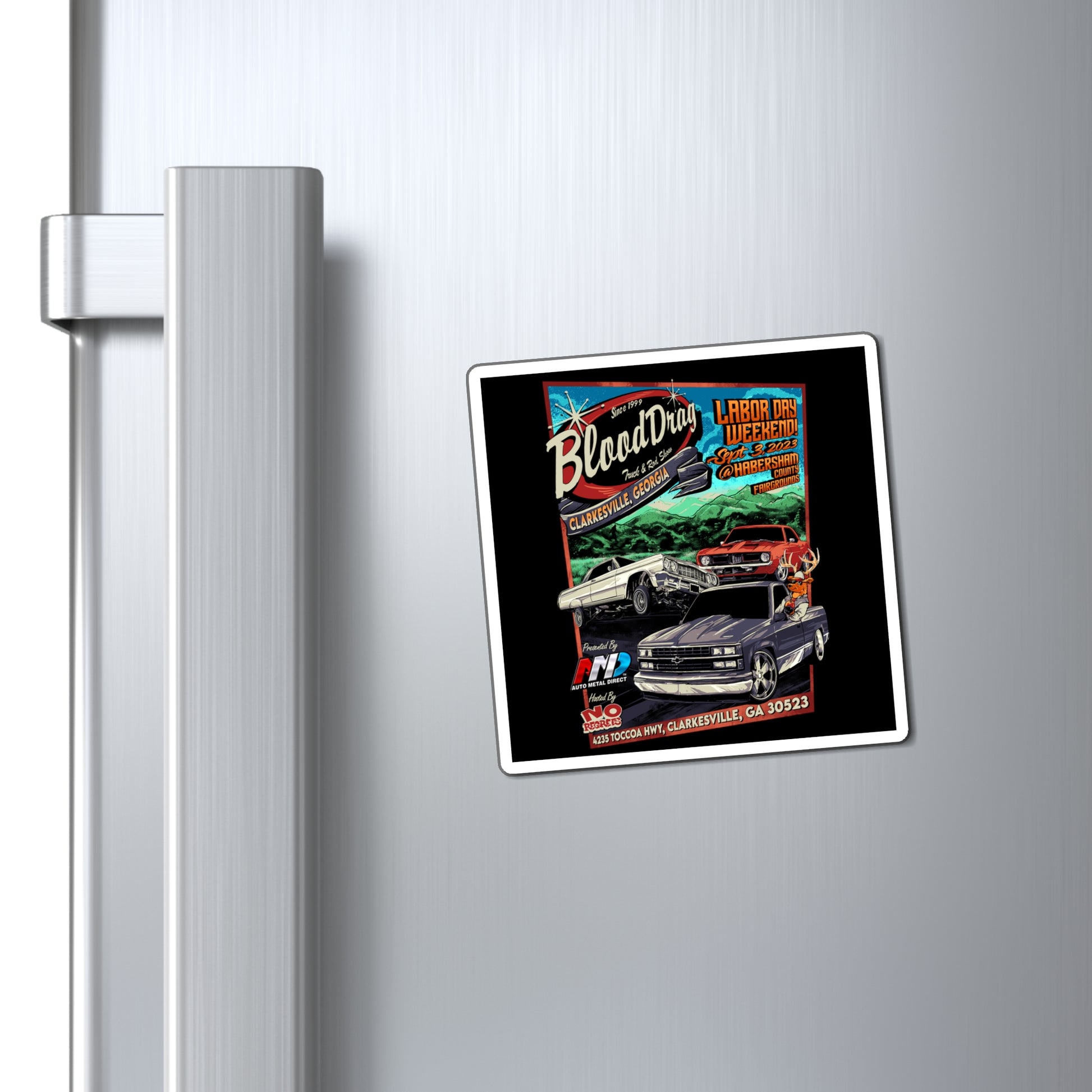 Showcase your passion for the roaring world of custom trucks and hot rods right in the heart of your home or workspace with the BloodDrag 2023 Fridge Magnet. This magnet is a daily reminder of the exhilaration and artistry that the BloodDrag Truck and Rod Show brought to life in 2023.