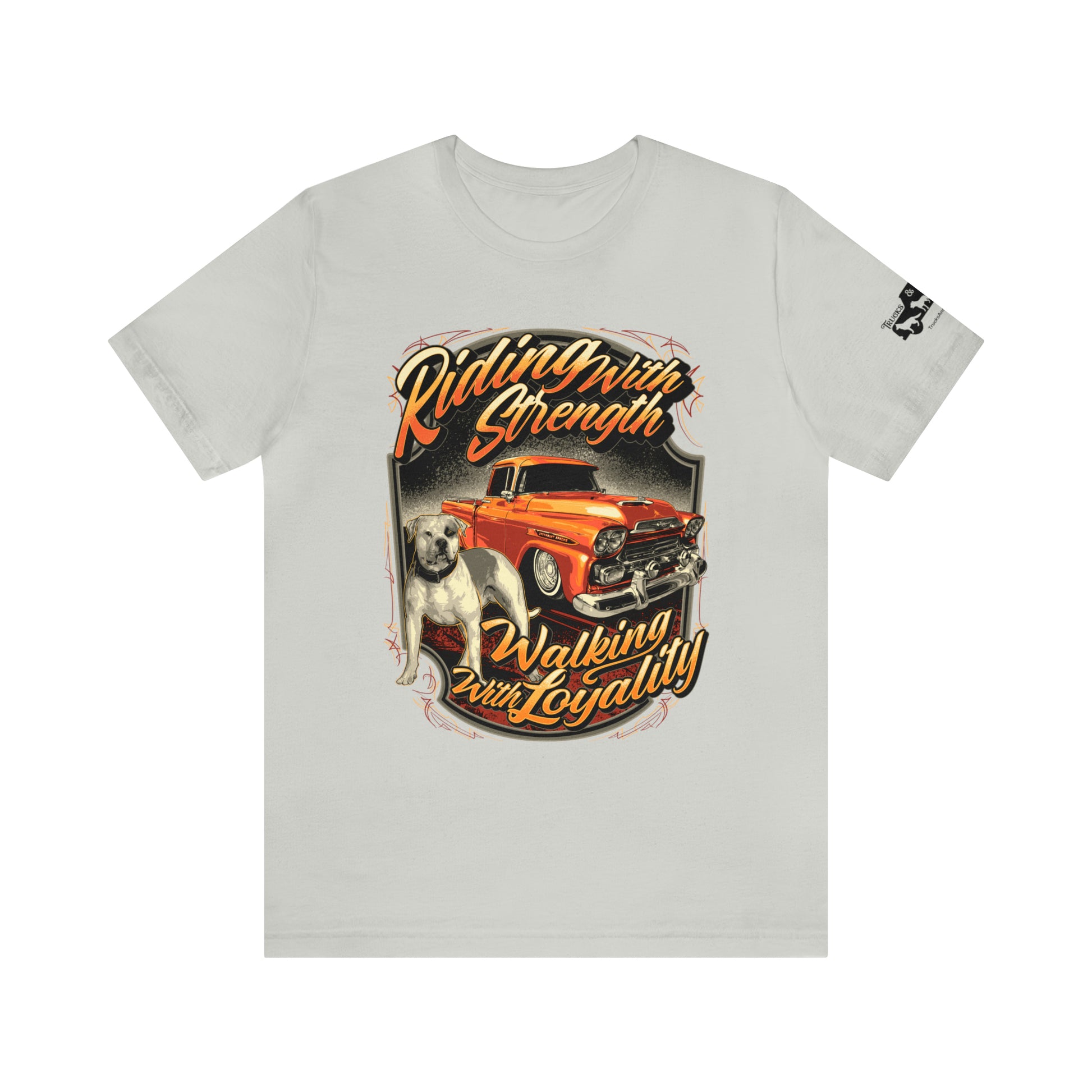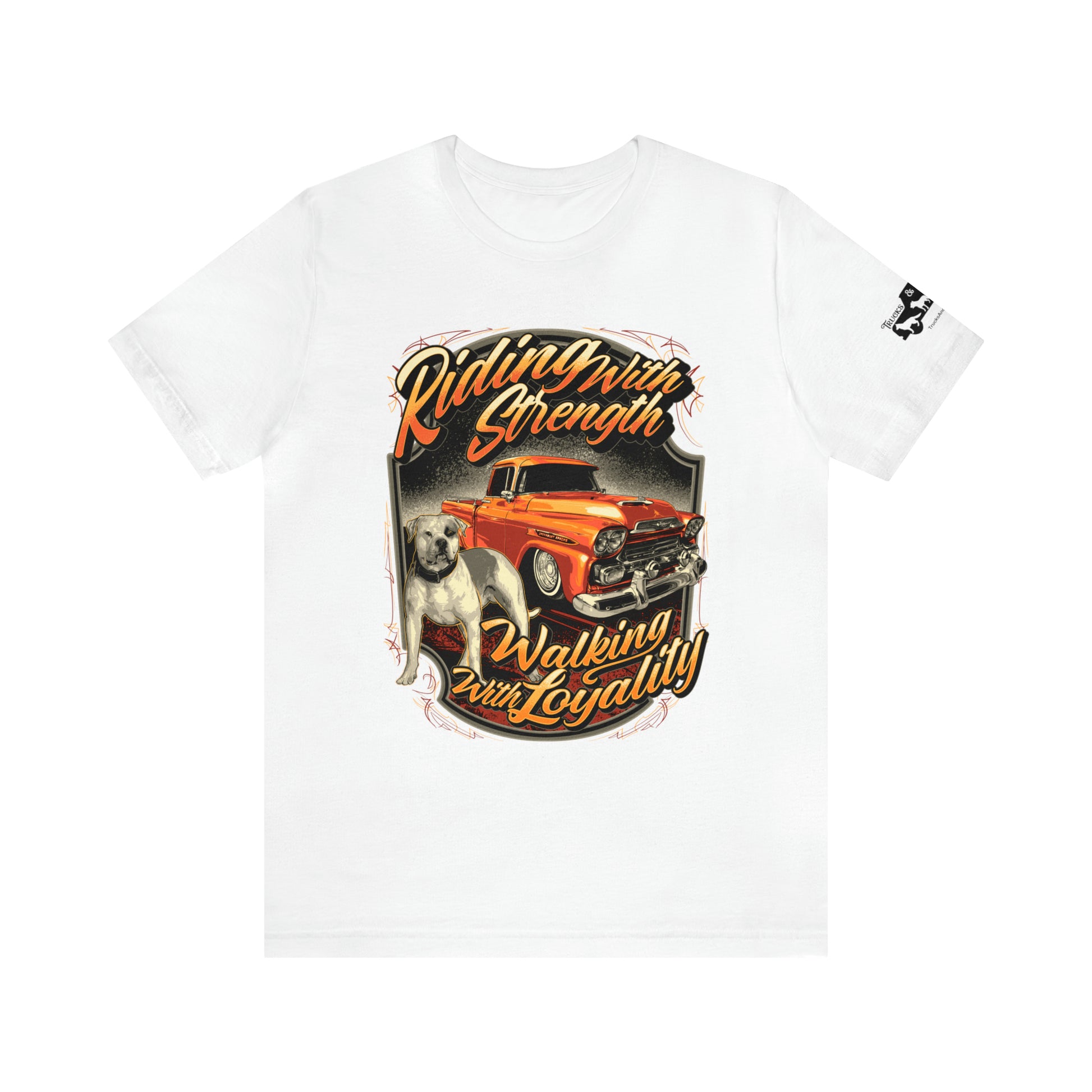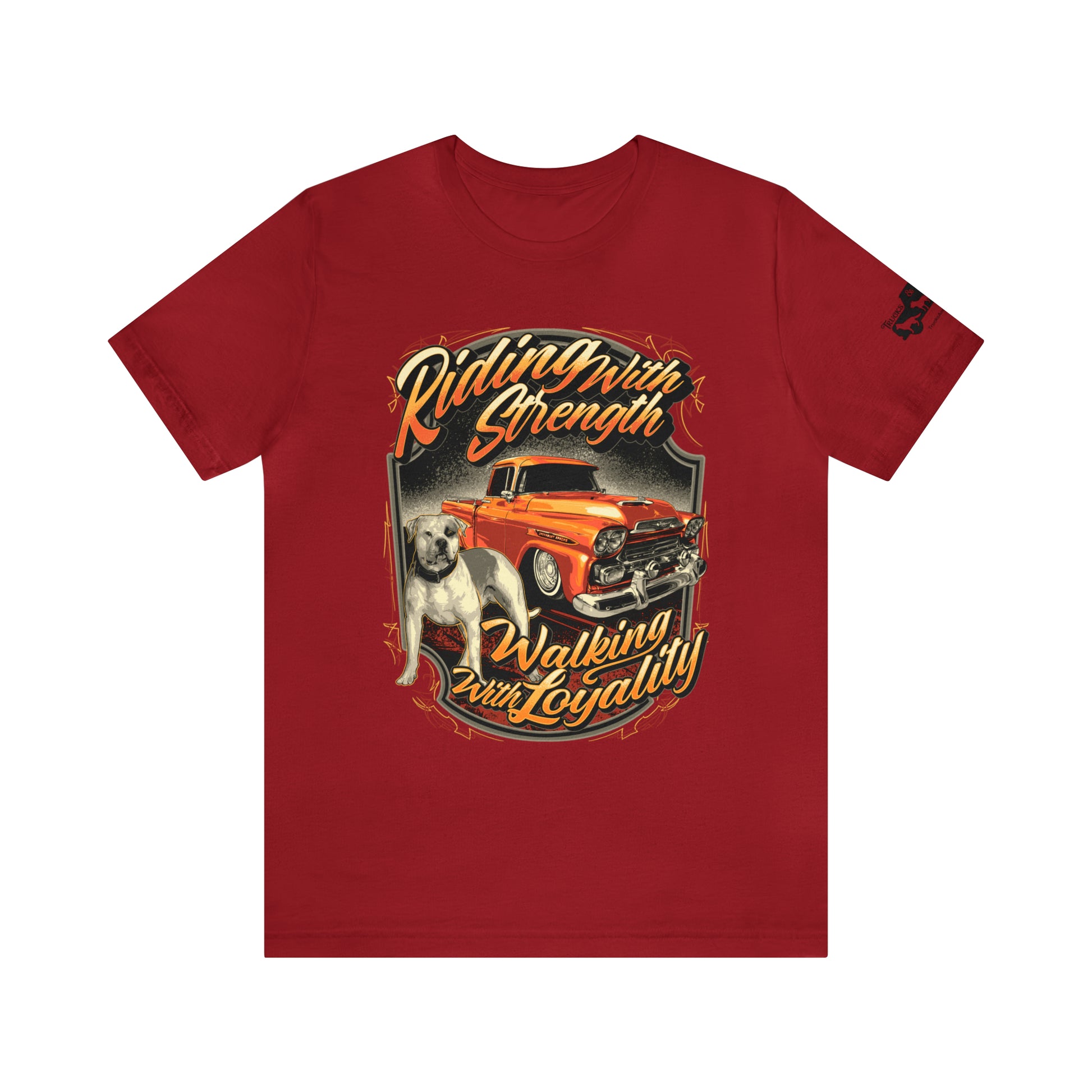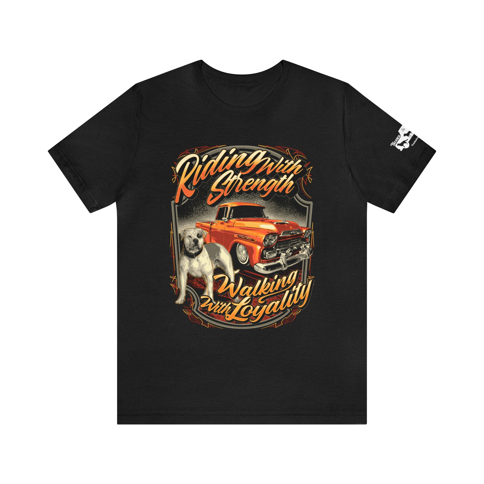 Introducing the first-ever design from our "Trucks And Dogs" apparel line, a spinoff from the iconic BloodDrag collection. Celebrating two of life's greatest joys, trucks and man's best friend, this shirt showcases a beautifully detailed 1959 Chevy Apache pickup truck alongside a proud and powerful American Bulldog. It's the perfect ensemble for those who appreciate the classic lines of vintage trucks and the unwavering loyalty of our canine companions.